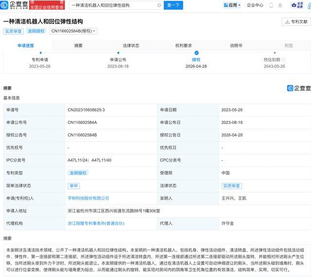 企查查APP显示,近日,宇树科技股份有限公司“一种清洁机器人和回位弹性结构”专利获授权。企查查专利摘要显示,本发明涉及清洁技术领域,本发明的一种清洁机器人,包括机身、弹性活动组件、清洁转盘,所述弹性活动组件包括活动组件、弹性件、第一连接部和第二连接部,所述弹性活动组件设于所述清洁转盘内,所述第一连接部通过所述第二连接部驱动所述刷头旋转,并能相对所述刷头产生位移,当所述刷头受到外力干涉时,所述刷头能退让。本发明提供的一种清洁机器人,通过在清洁机器人上设置可自动伸缩退让的刷头,当所述刷头碰到墙角时,刷头可以进行位姿变换,使得刷头能与墙角更为贴合,从而能通过刷头的旋转,能实现对房间内的阴角等卫生死角位置的有效清洁,结构简单、实用,切实可行。